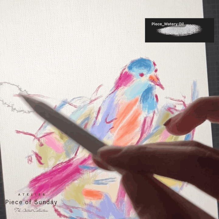 실제 유화 물감이 섞이듯 캔버스 위에서 색이 혼합됩니다. 인위적인 블렌딩이 아닌 붓터치를 더하며 밀도와 풍부함을 더해줍니다.